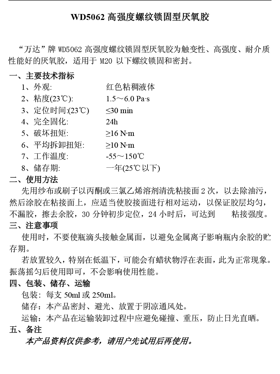 WD5062 高強(qiáng)度螺紋膠