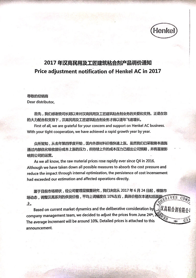 2017年漢高百得粘合劑產(chǎn)品調(diào)價通知(10%)