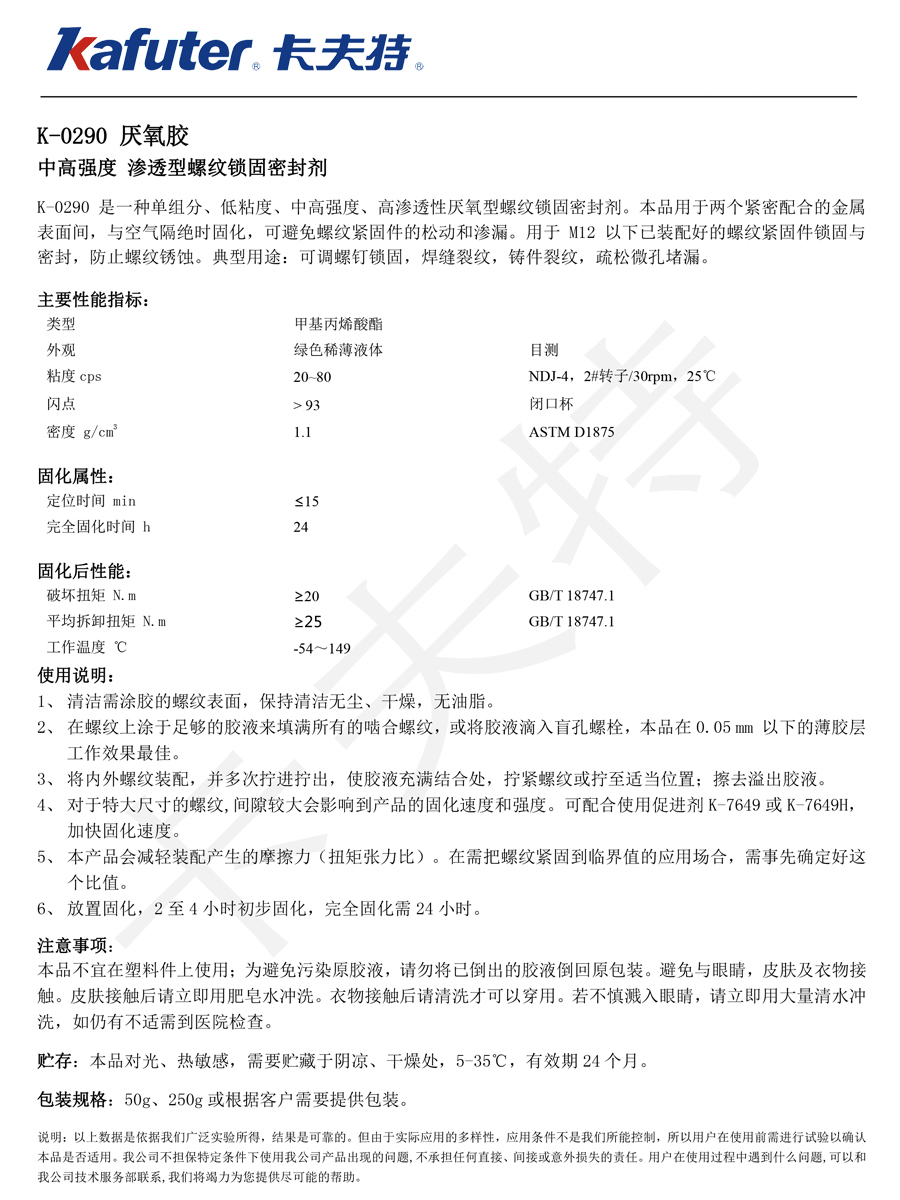 K-0290高強(qiáng)度螺紋鎖固密封劑